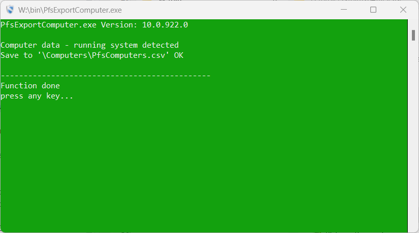 PfsExportComputer.exe ist ein Kommandozeilenprogramm zum exportieren der Computerdaten. Sie finden das Programm im Bin-Verzeichnis auf dem PFS-Protect Installationsmedium.