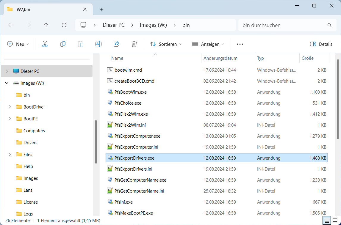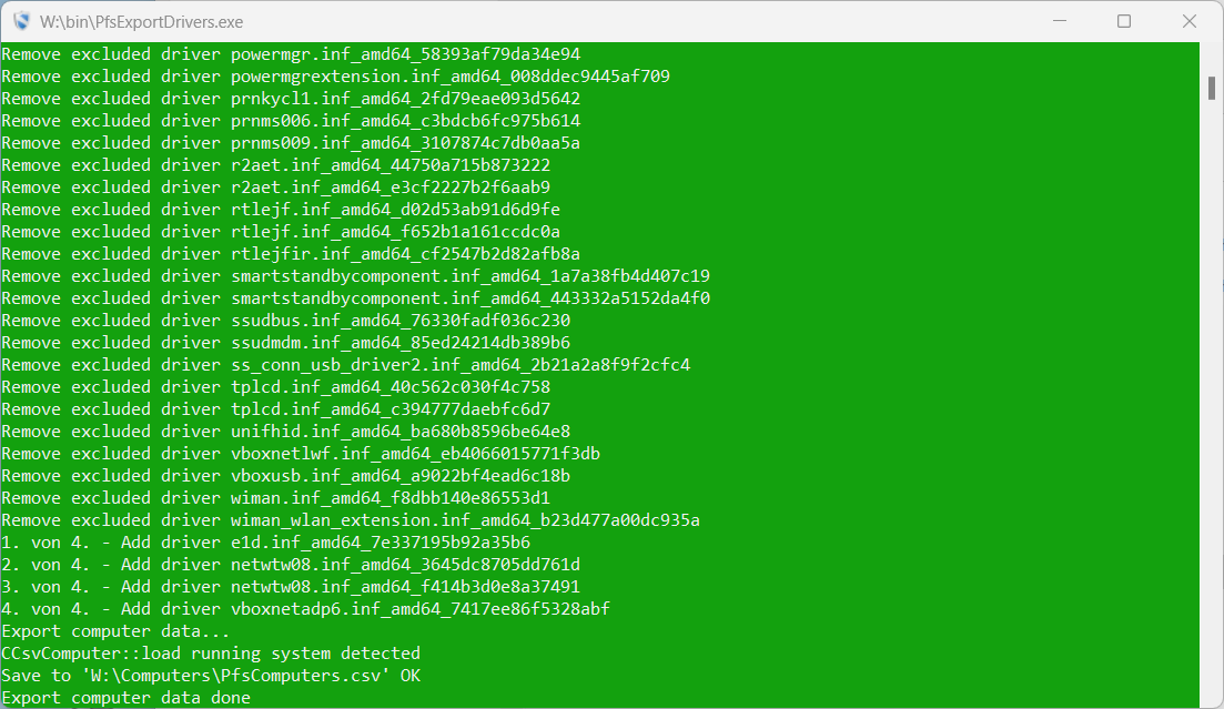 PfsExportDrivers.exe ist ein Kommandozeilenprogramm zum exportieren von Treibern, Computerdaten, LAN- und WLAN-Einstellungen. Sie finden das Programm im Bin-Verzeichnis auf dem PFS-Protect Installationsmedium.