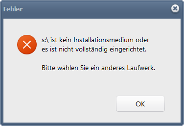 Wurde das Ziellaufwerk nicht als Installationsmedium (Images) erkannt, sehen Sie folgenden Fehler.