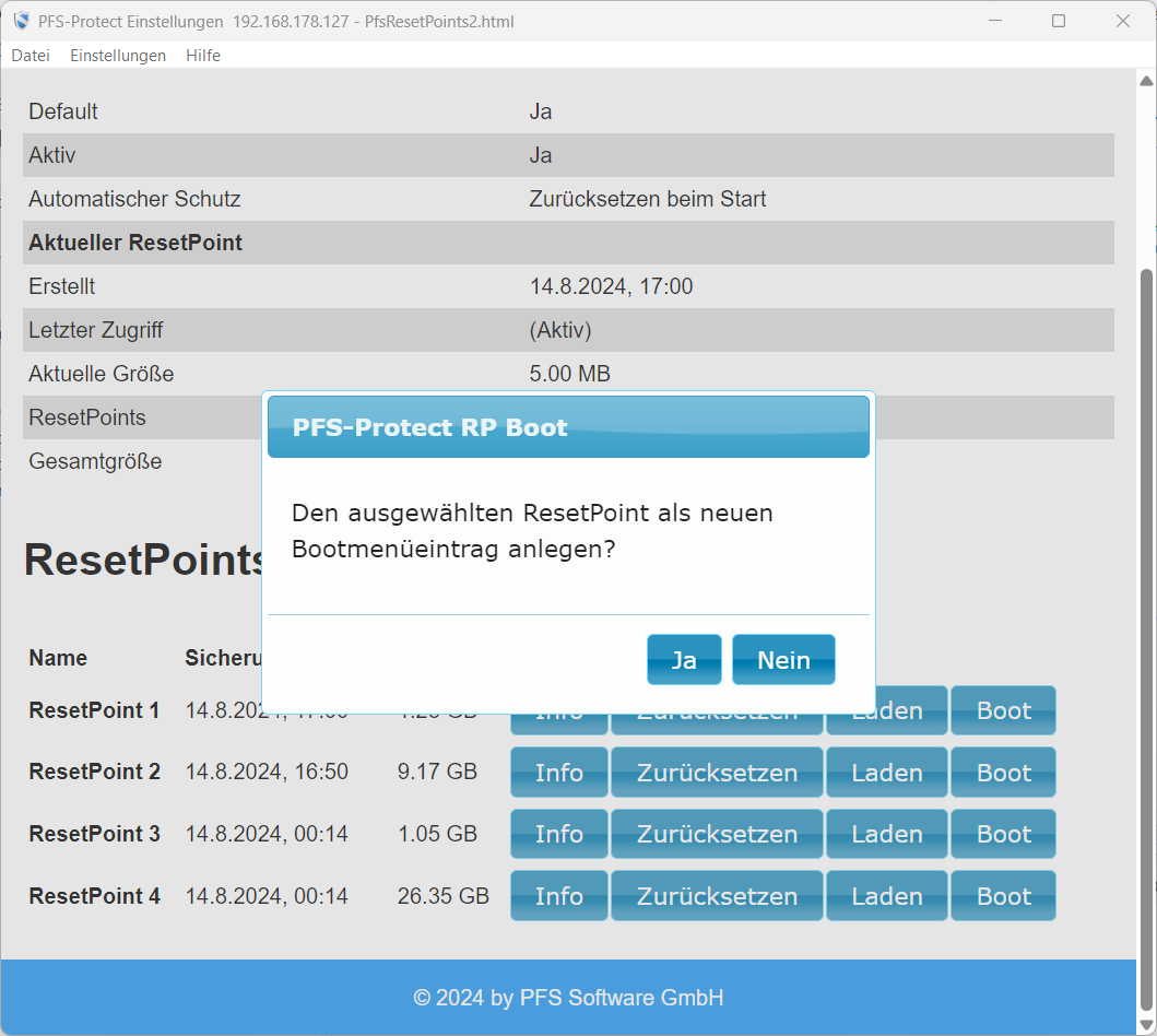 Wählen Sie den ResetPoint und klicken sie den Button 'Boot'.