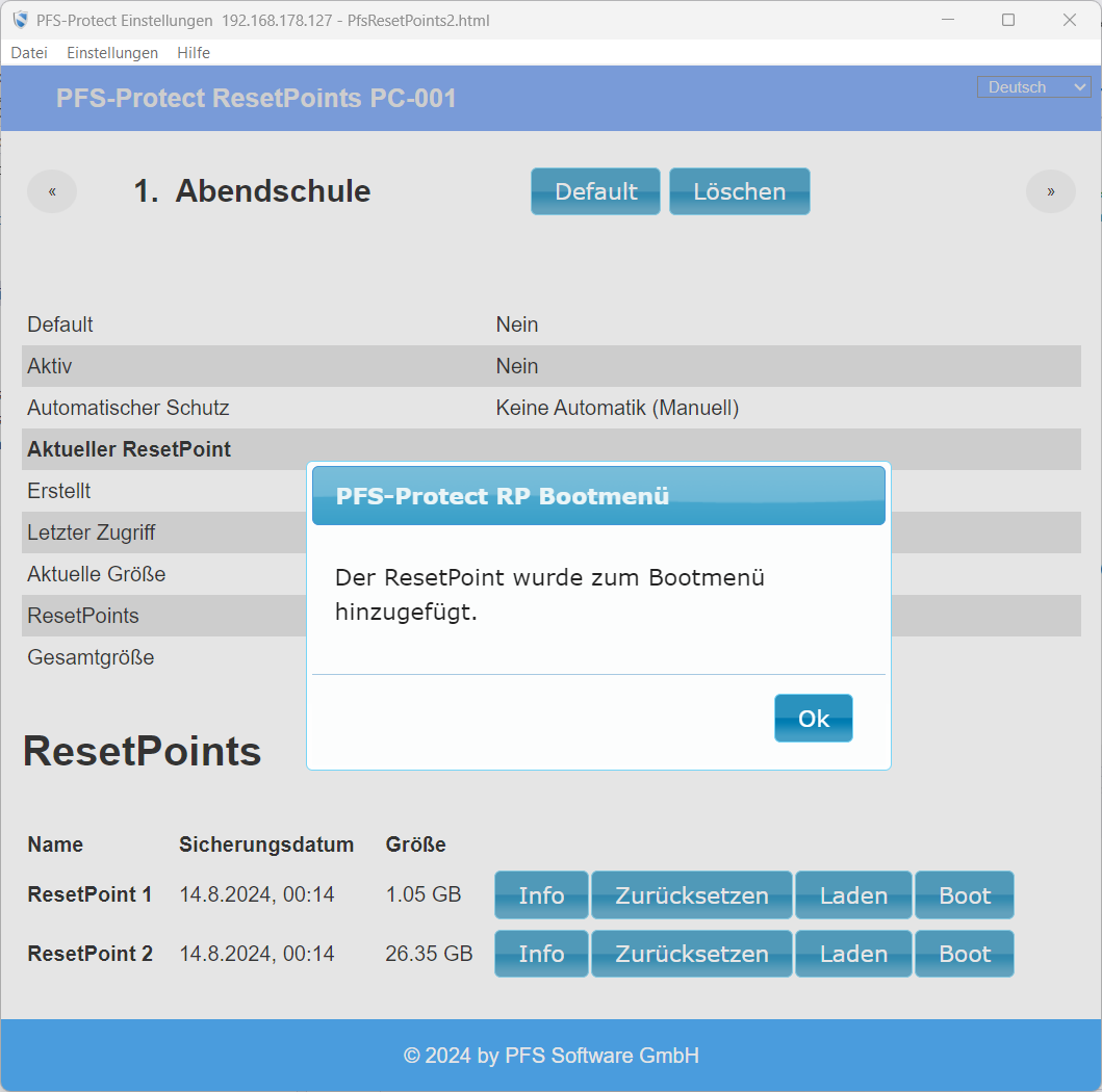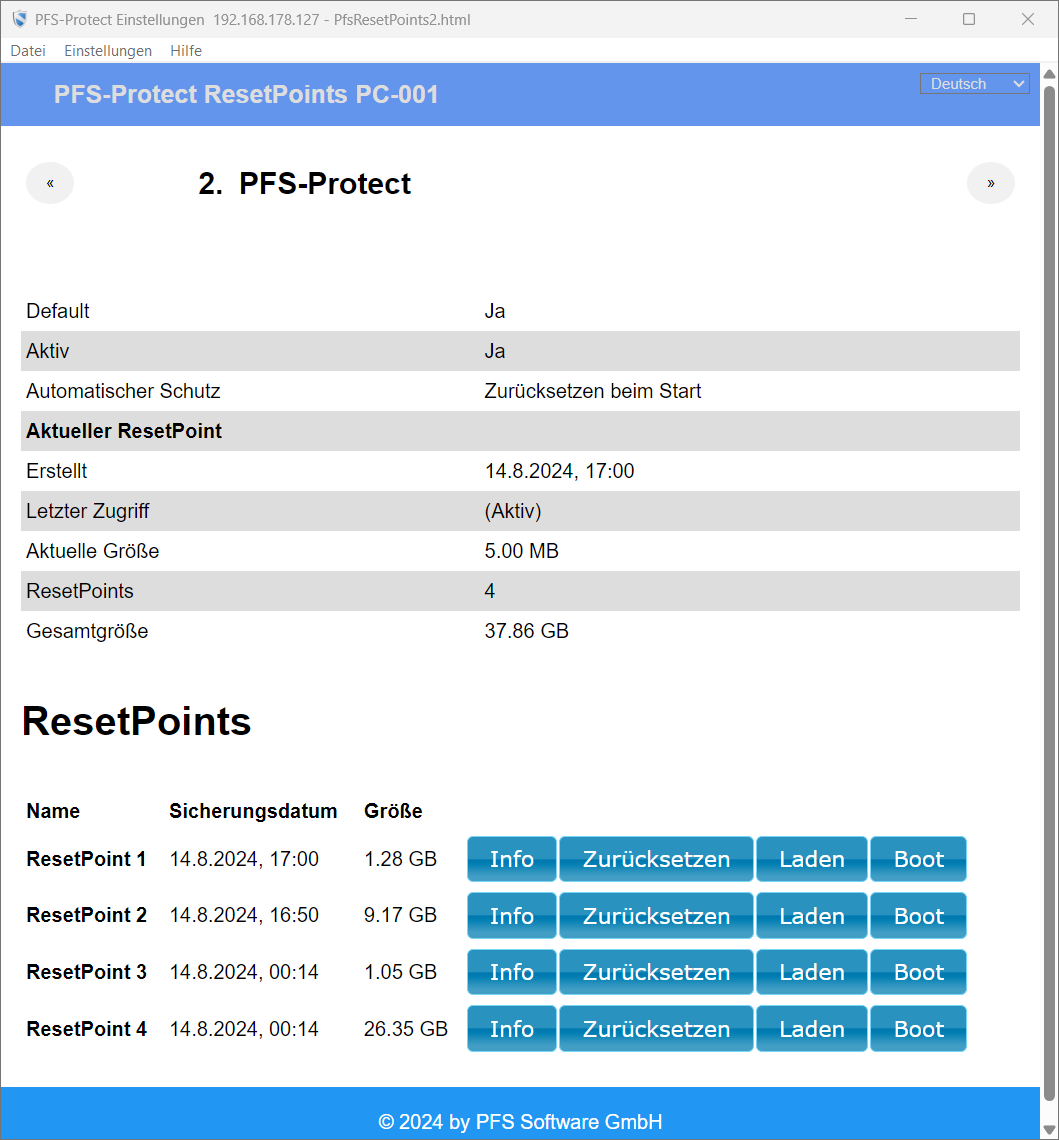 Hier finden Sie die Liste der ResetPoints. Wie bereits erwähnt, sind gemeinsamme ResetPoints vor dem Löschen geschützt.