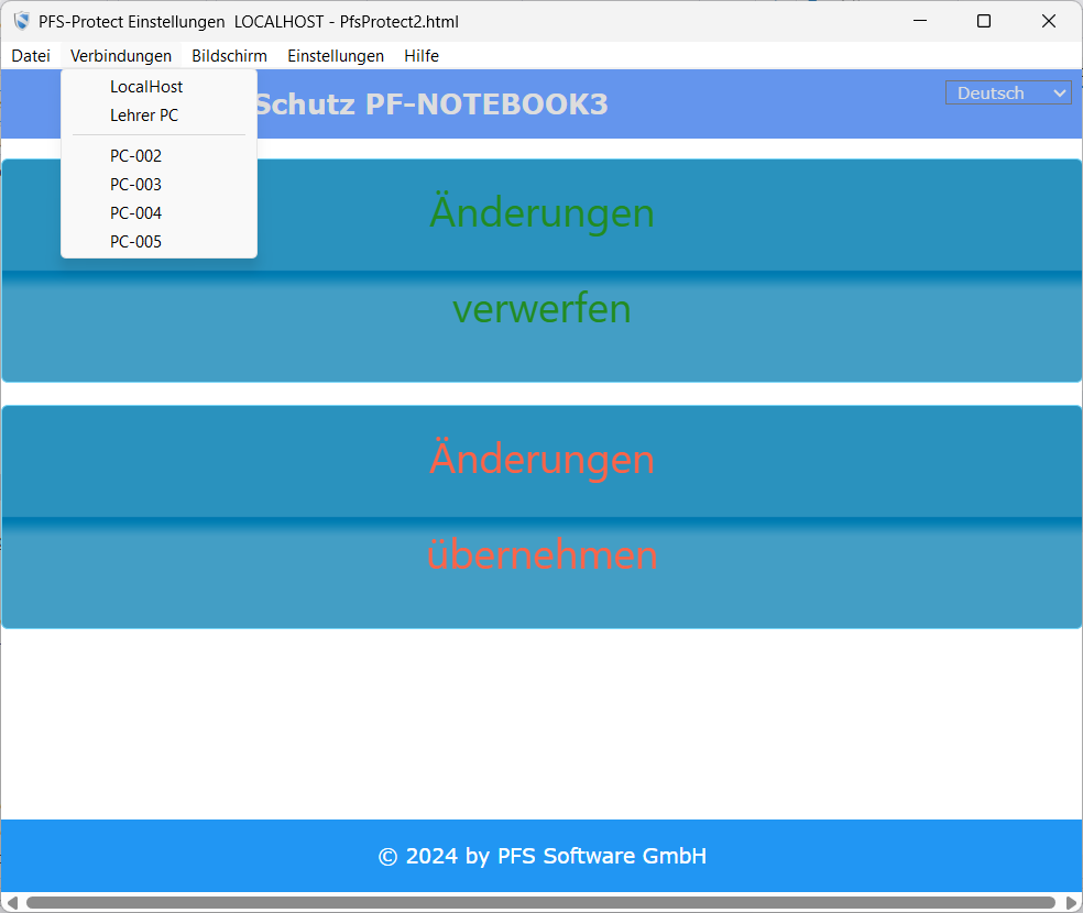 Beachten Sie das in der Oberfläche immer der reale Computername angezeigt wird und alle Einstellungen und Aktionen auf diesem Gerät durchgeführt werden.