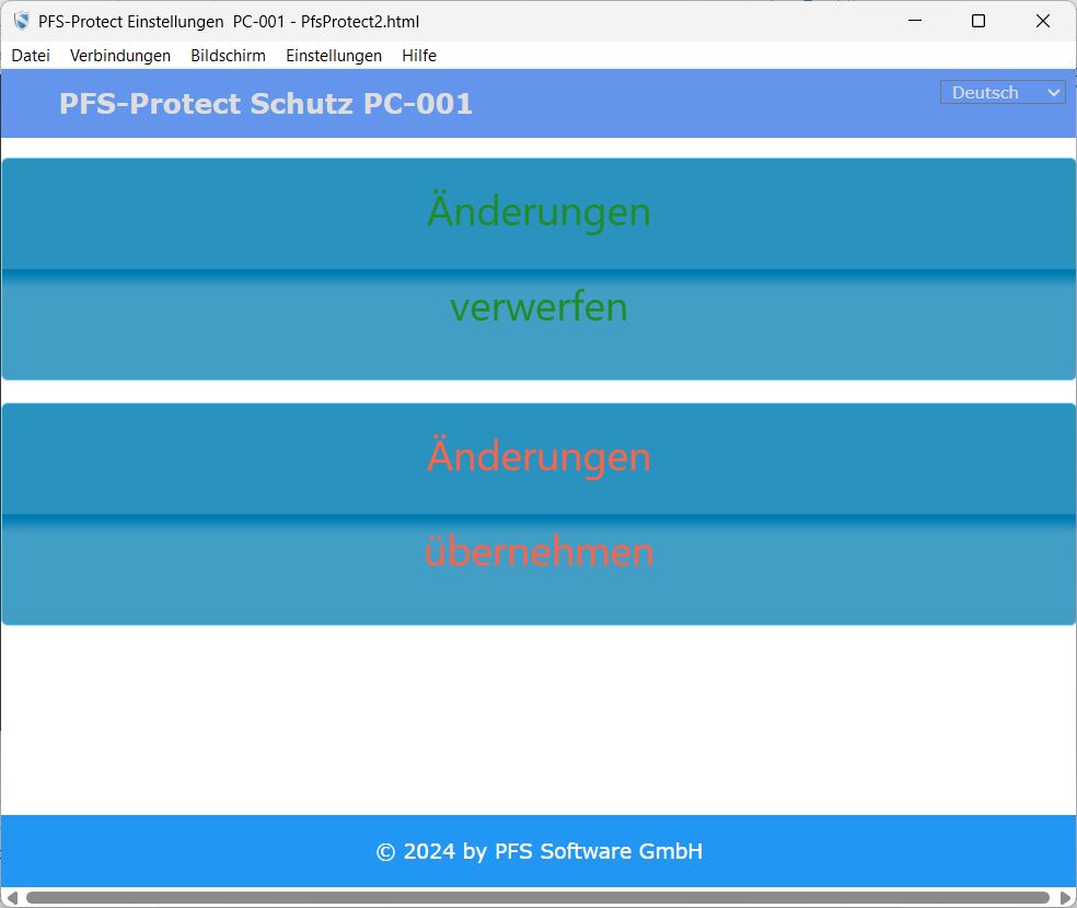 Speichern Sie die Änderungen und starten Sie die Applikation PfsProtectConfig.exe (oder 'PFS-Protect Einstellung' aus dem Windows Haupmenü) neu.