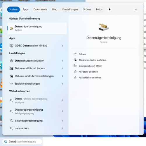 Unter Windows 11 geben Sie in der Suchleiste 'Datenträgerbereiningung' ein...