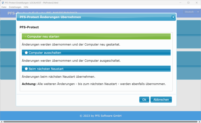 Wählen Sie hier 'Computer neu starten' und drücken Sie den Button 'OK'.